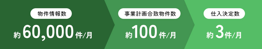 約60,000件/月の情報の中から判定アプリによるフィルタリングを行い、クリアした物件について調査・検討を実施。その中から融資が出やすいエリアの駅徒歩10分圏内に限定して仕入れを実施しています。