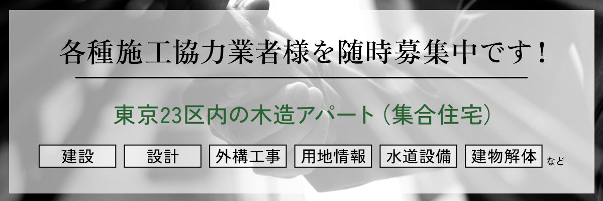 当社では、業務拡大およびお客様の満足度向上を目指し、東京23区内における木造アパート(集合住宅)の新築工事に関する各種施工協力業者様を随時募集しております。